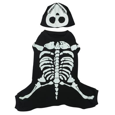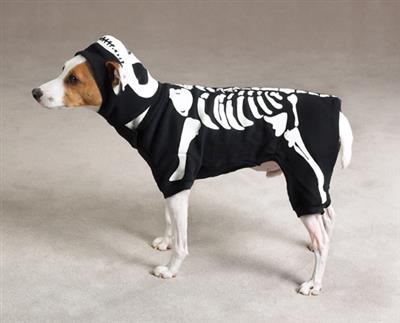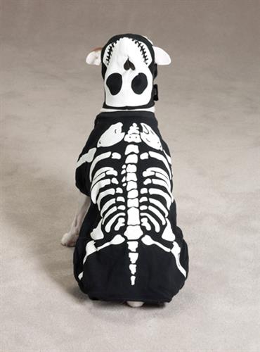 The spooky glowing skeleton on the Casual Canine® Glow Bones Costume stands out on a dark Halloween night!