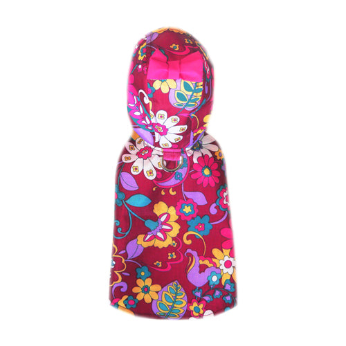 Retro-print raincoat with easy to clean polyester, a bow and D ring. Velcro closures. 100% polyester. Burgundy.