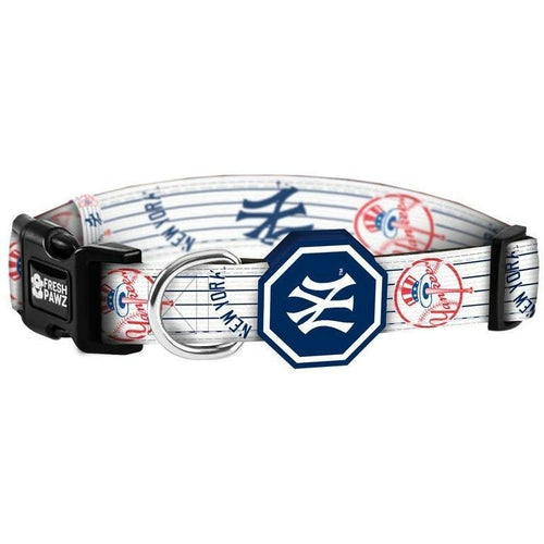 Belonging to the officially licensed MLB Collection, the New York Yankees Dog collar provides an iconic look for any diehard fan. Featuring the signature navy pin stripes and classic Yankees logo, the NY Yankees x Fresh Pawz collection provides a great look for your dog.