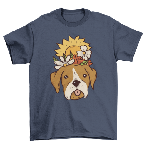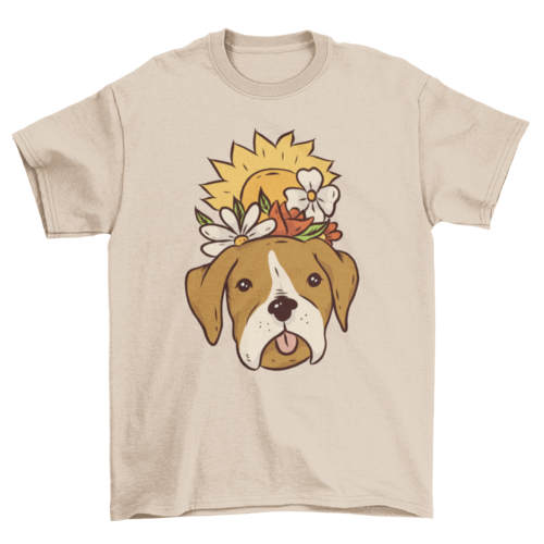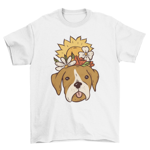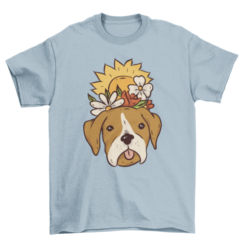 Floral Dog T-Shirt Design featuring a cute dog with some Spring flowers and a sun coming up perfect for puppy lovers!