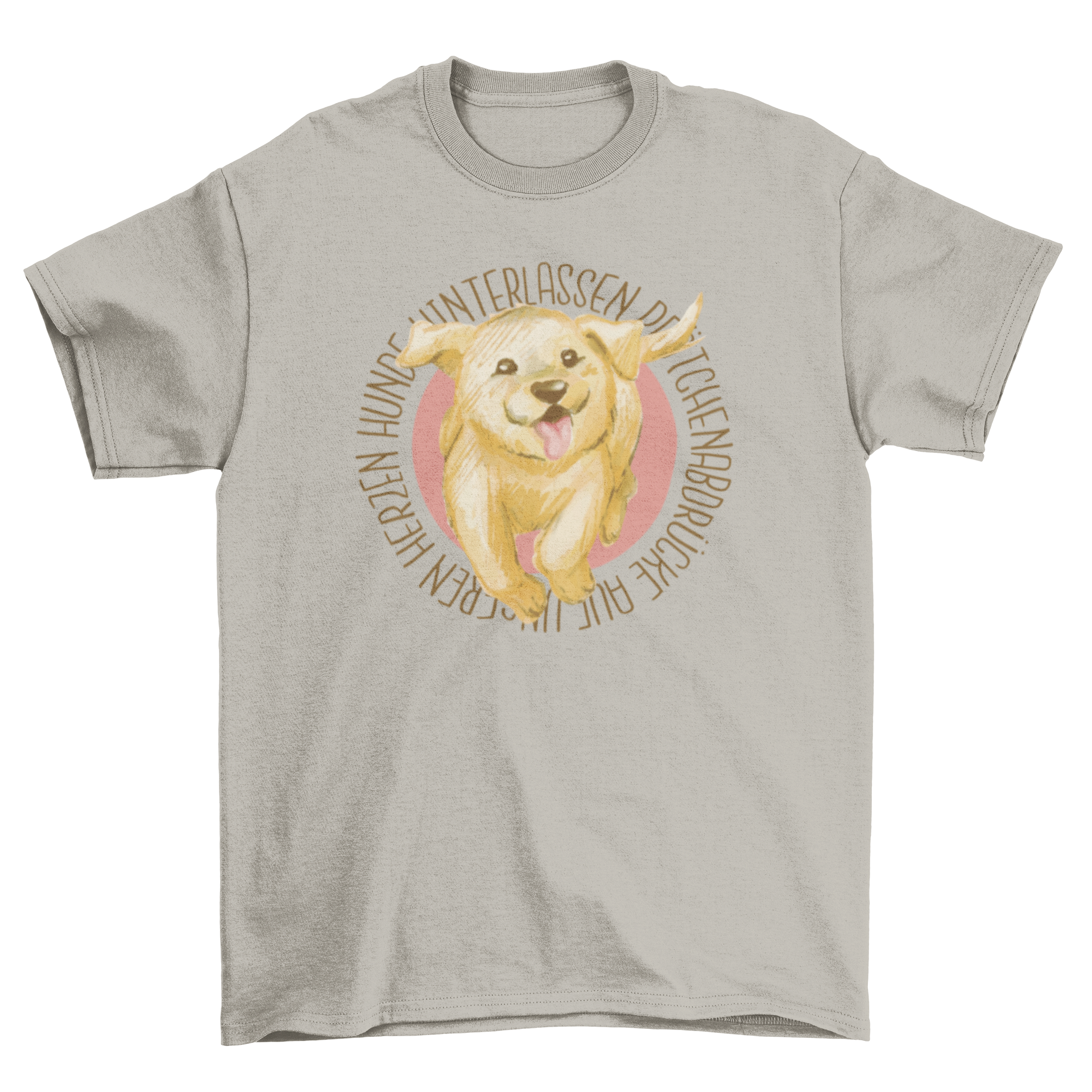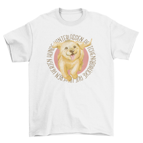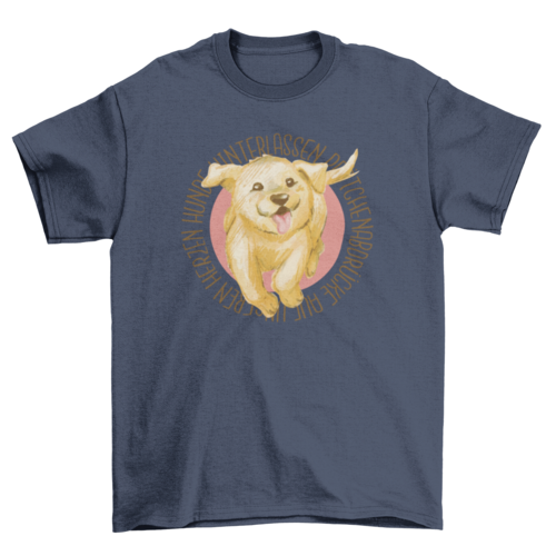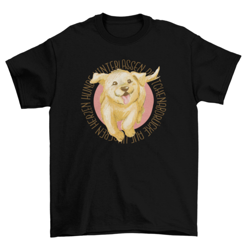 Amazing t-shirt design that features an adorable golden retriever puppy running in hand drawn style.